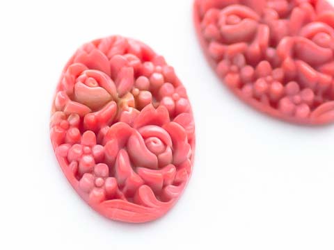 お花のレリーフが繊細なガラス製の大きめパーツをペンダントにしています。バラが大きく2輪彫られているので、横向きにセッティングをして存在感をUPしてみました。