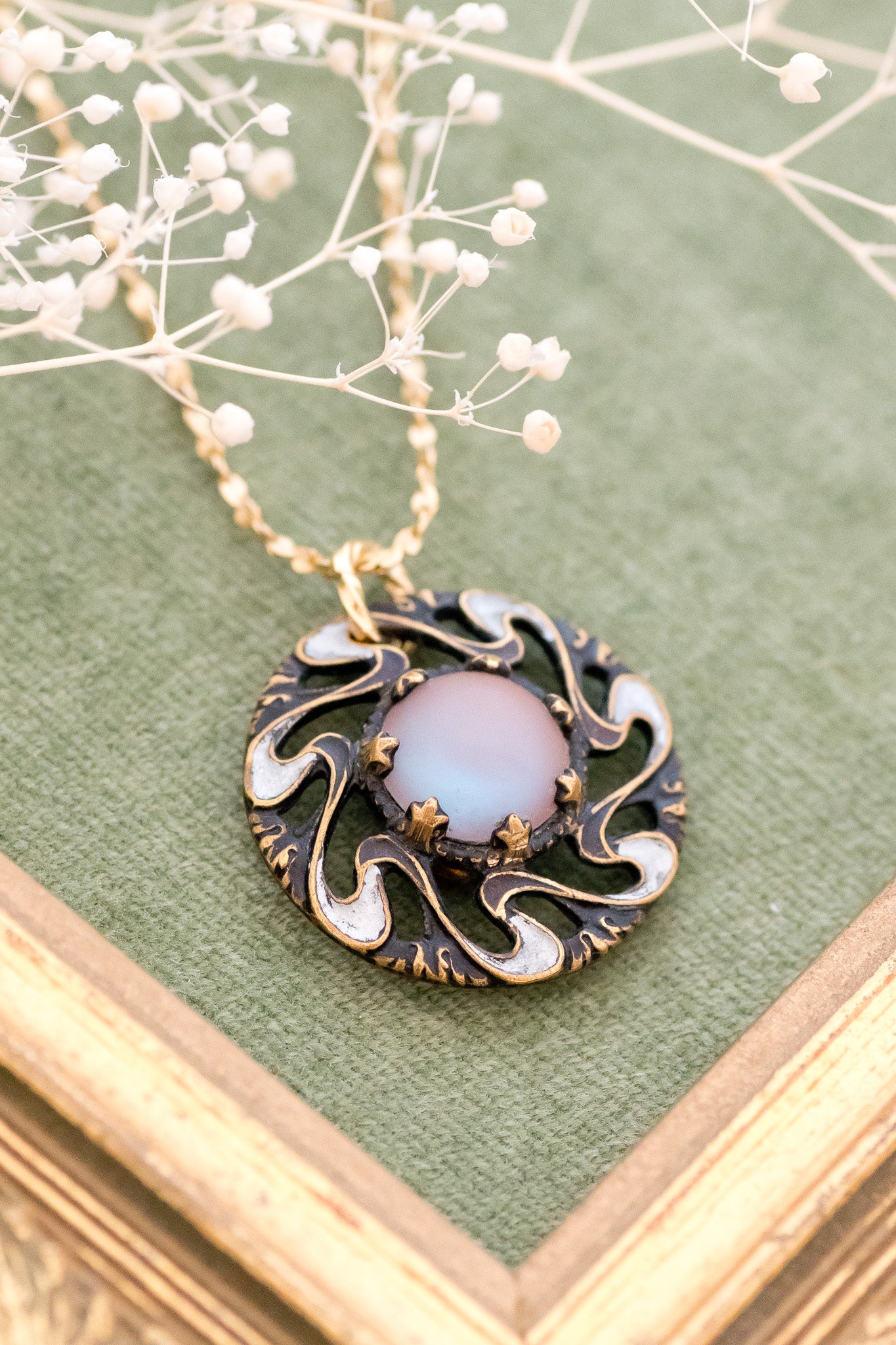 こちらのペンダント、実はオーバル型のカボションをナベット型の台座にセッティングしている形になりますが、上述のオーバルセッティングでのペンダントとはまた違ったスタイリッシュな印象をまとっています。