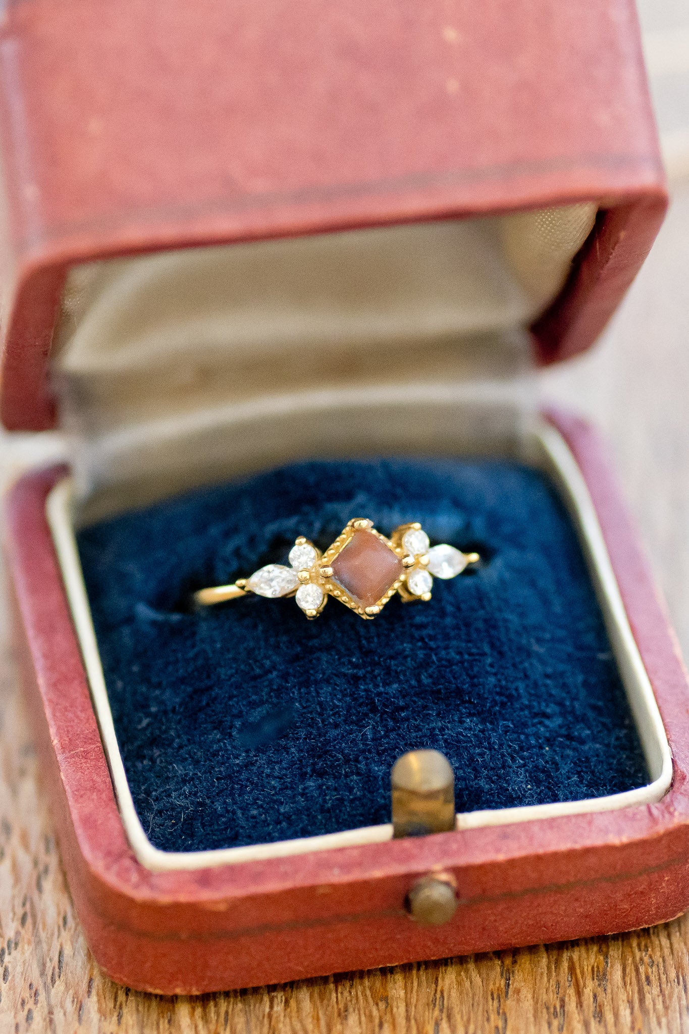 リングはパープルピンクカラーが浮かび上がるレアカラー。真横と正面では色合いが異なり、シュッとしたスタイリッシュな形でありながら、リッチなお色味と台座のピンクゴールドカラーが身に着けた時に高揚感をもたらしてくれます。