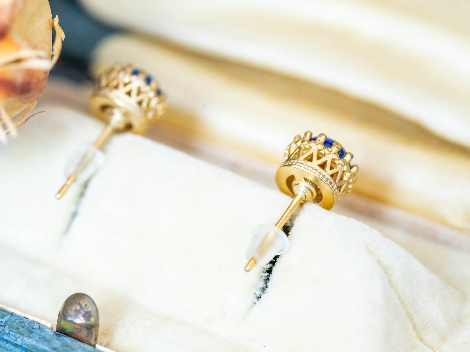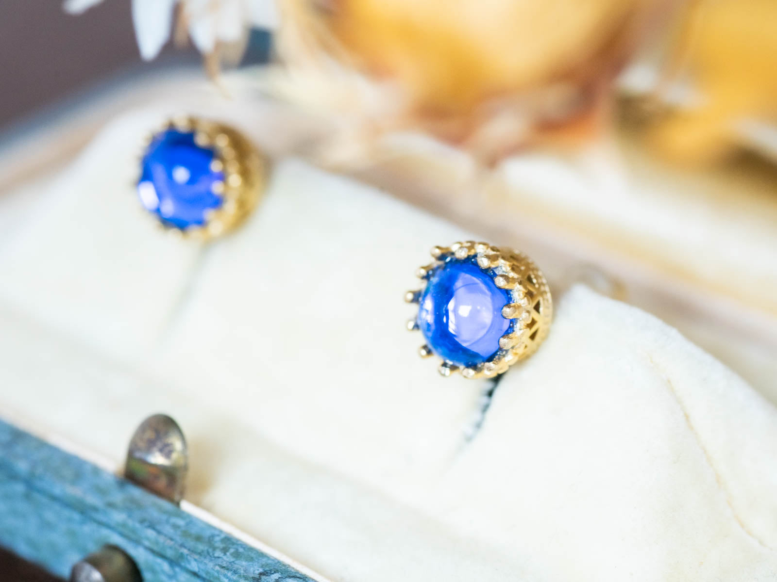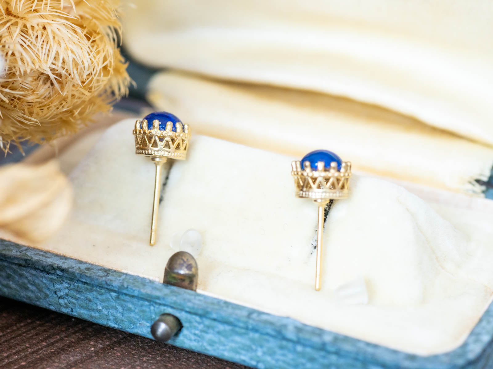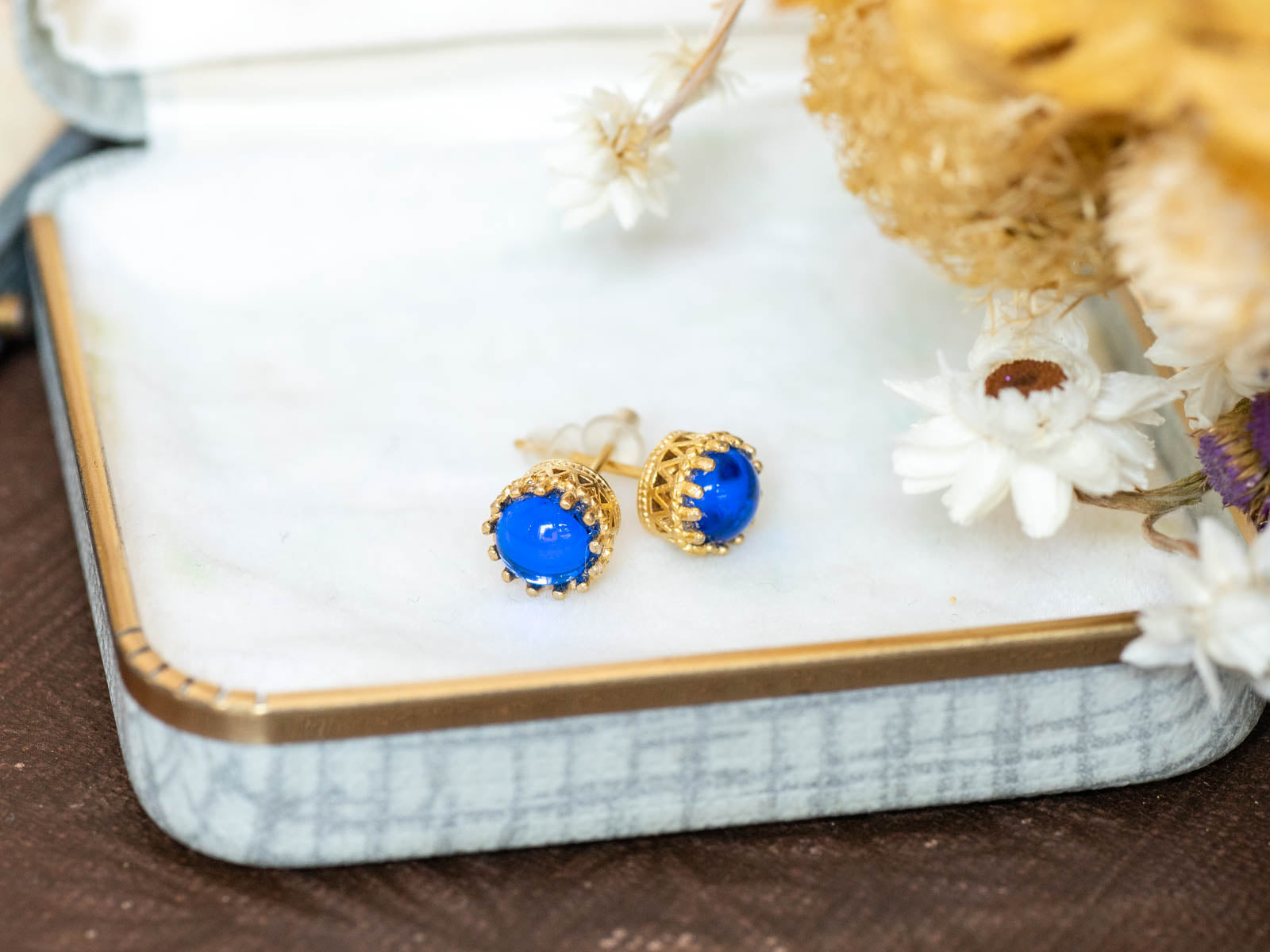 マリンブルーカラーのヴィンテージガラス・クラウンピアス