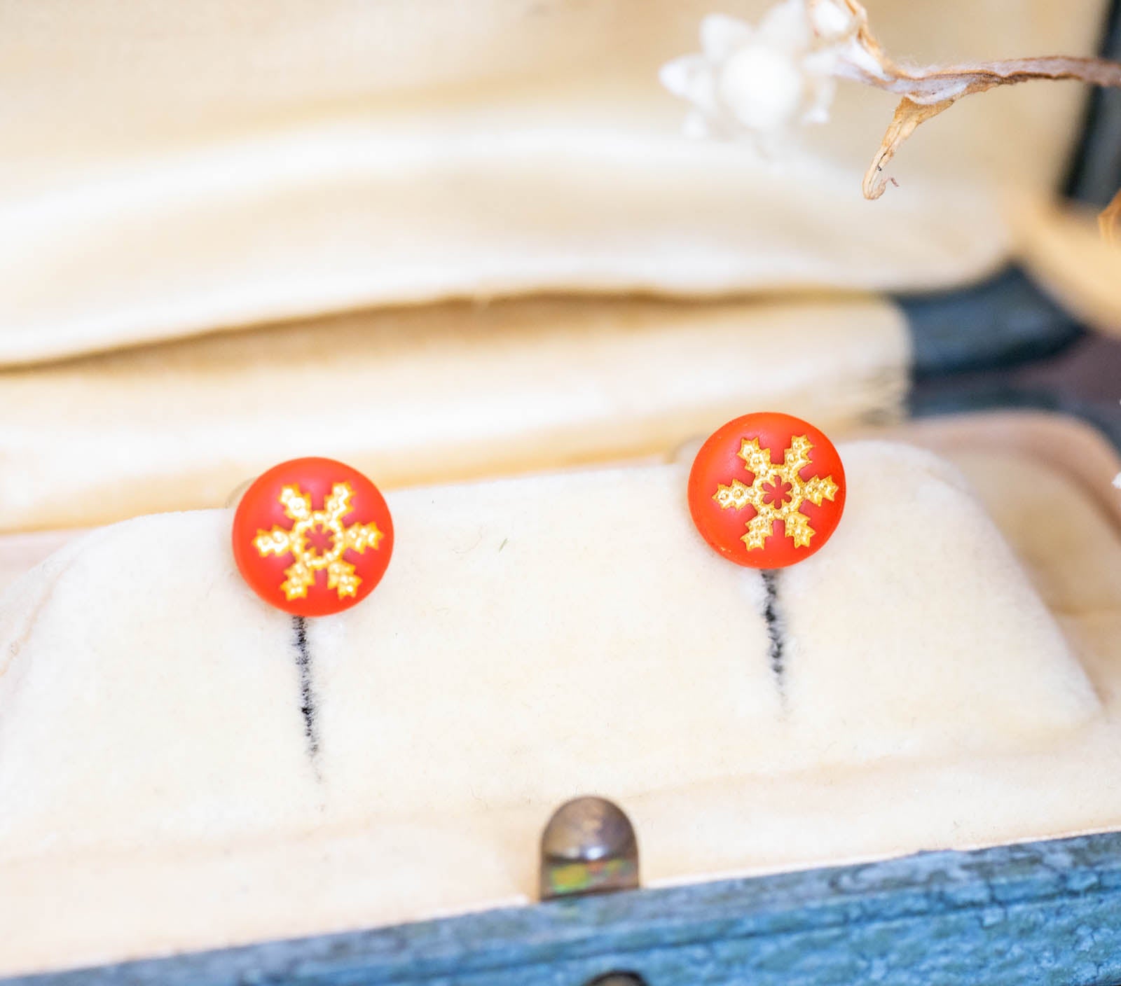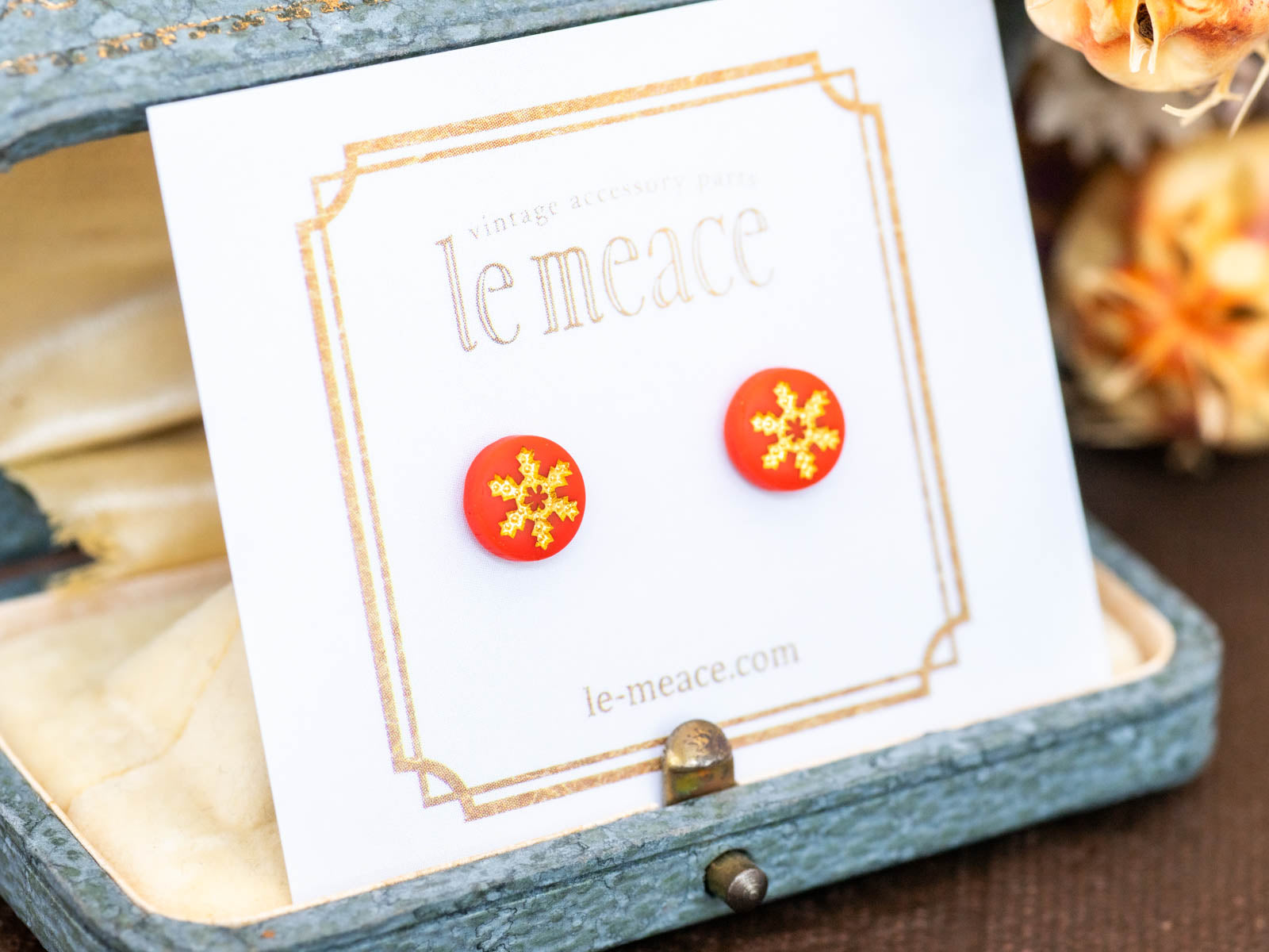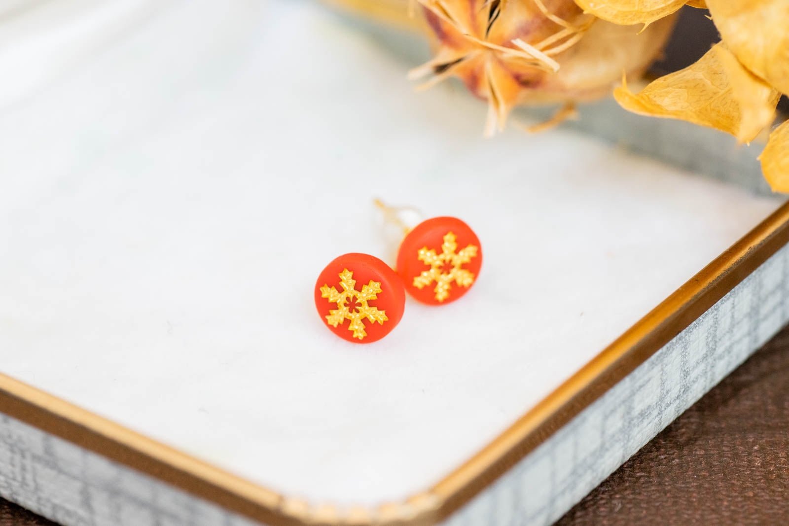 オレンジにゴールドのスノーフレークが内彫りされたピアス