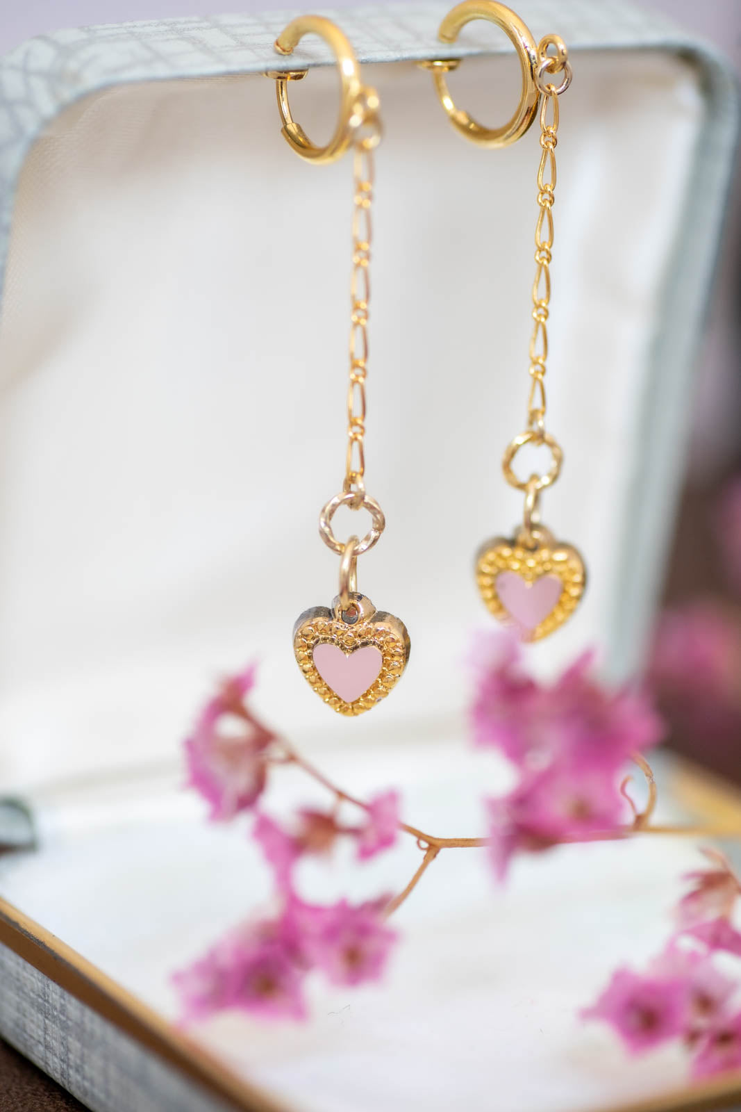 フープイヤリング金具にレースチェーンパーツを取り付け、さらにハートのペンダントパーツがセットされた完成品イヤリングです。