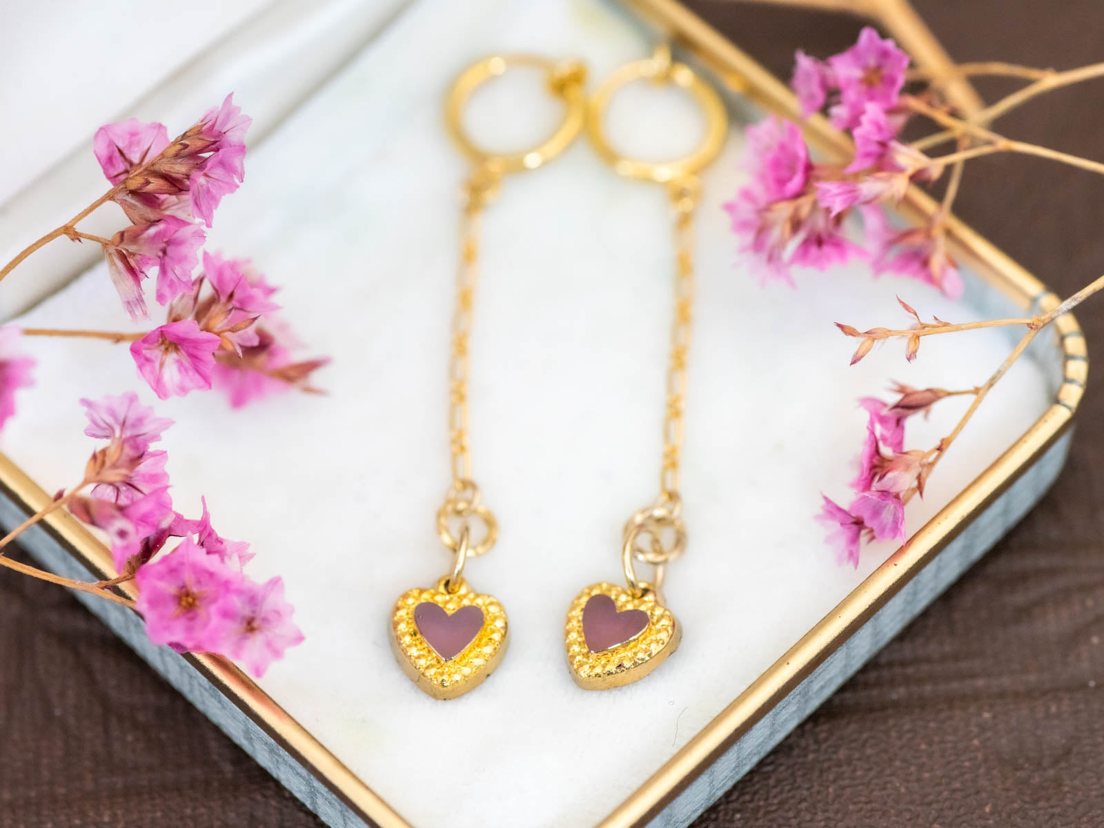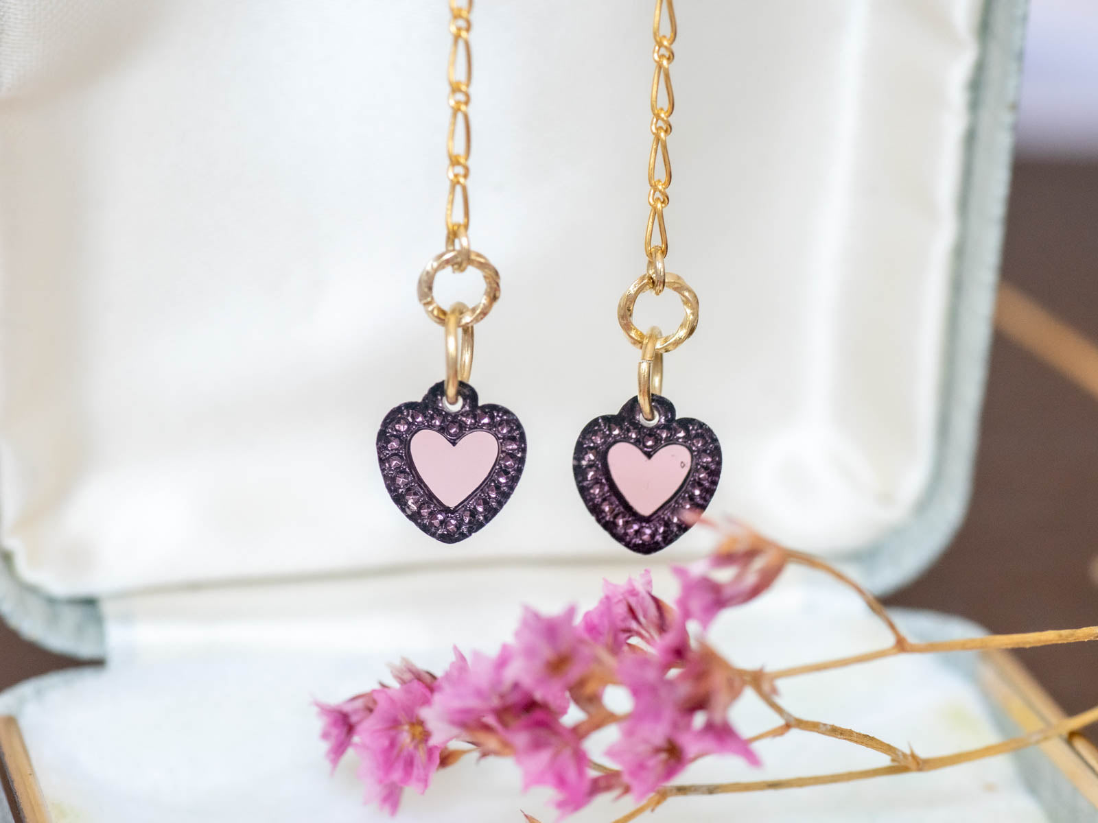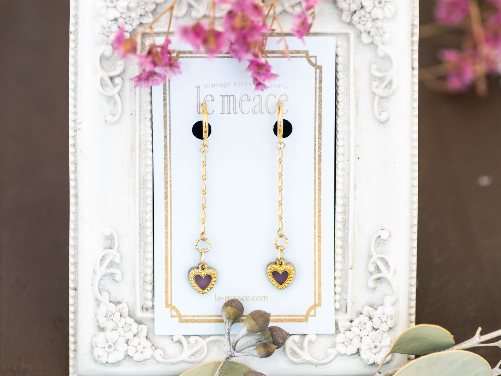 クリアなアメジストカラーのハートがさりげなく甘く上品なアクセントになって、