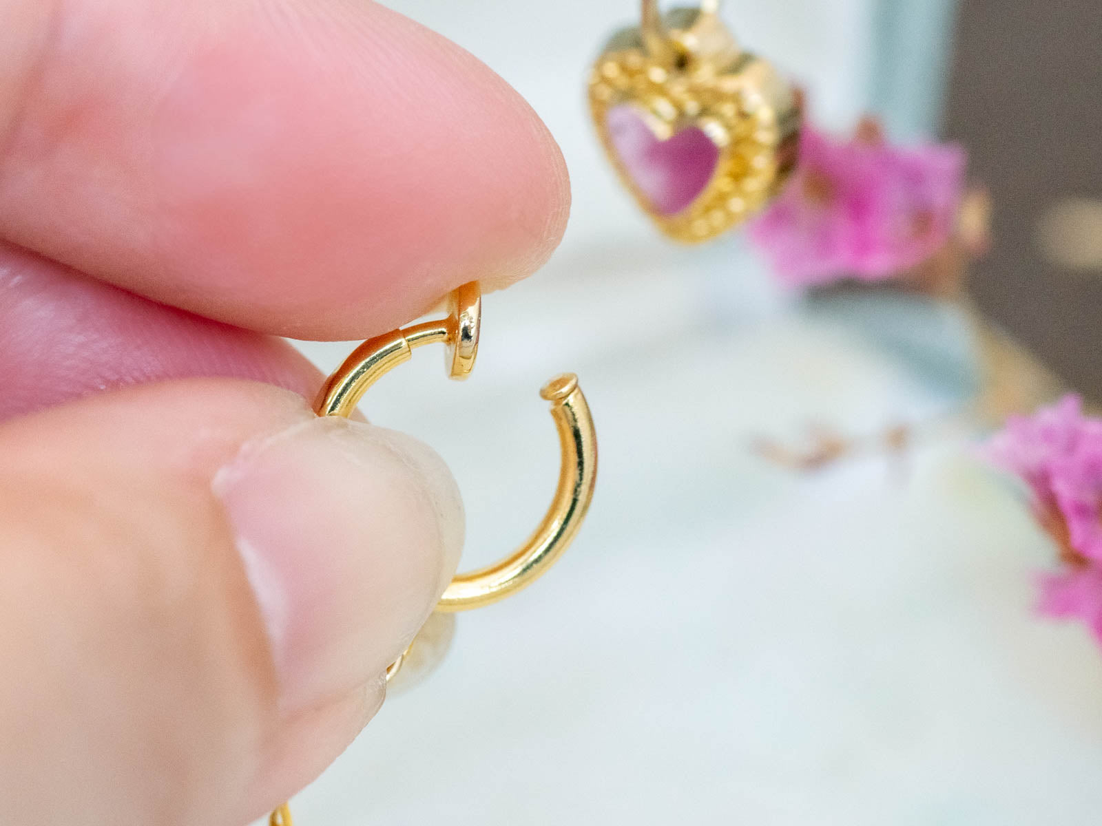 フープタイプのイヤリングは後ろ側にあるレバーを引いて隙間から挟み込むようにおつけするタイプです。