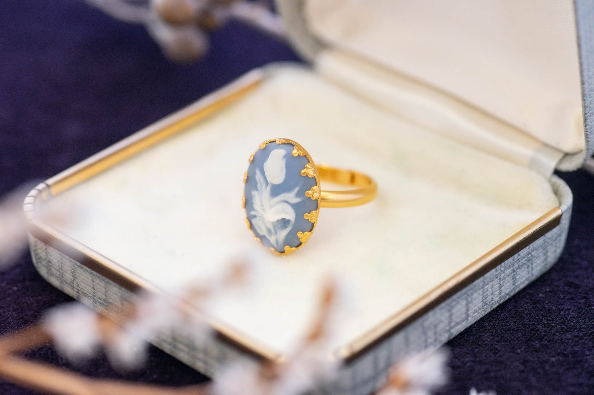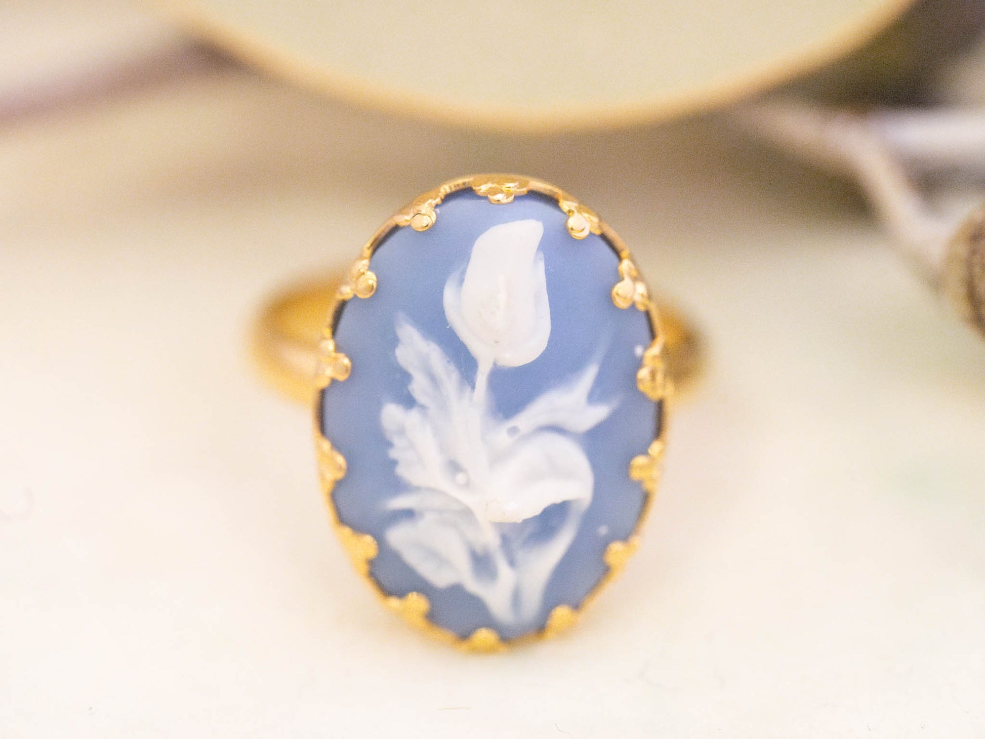 チューリップが彫られたブルーグレーのカメオのリング