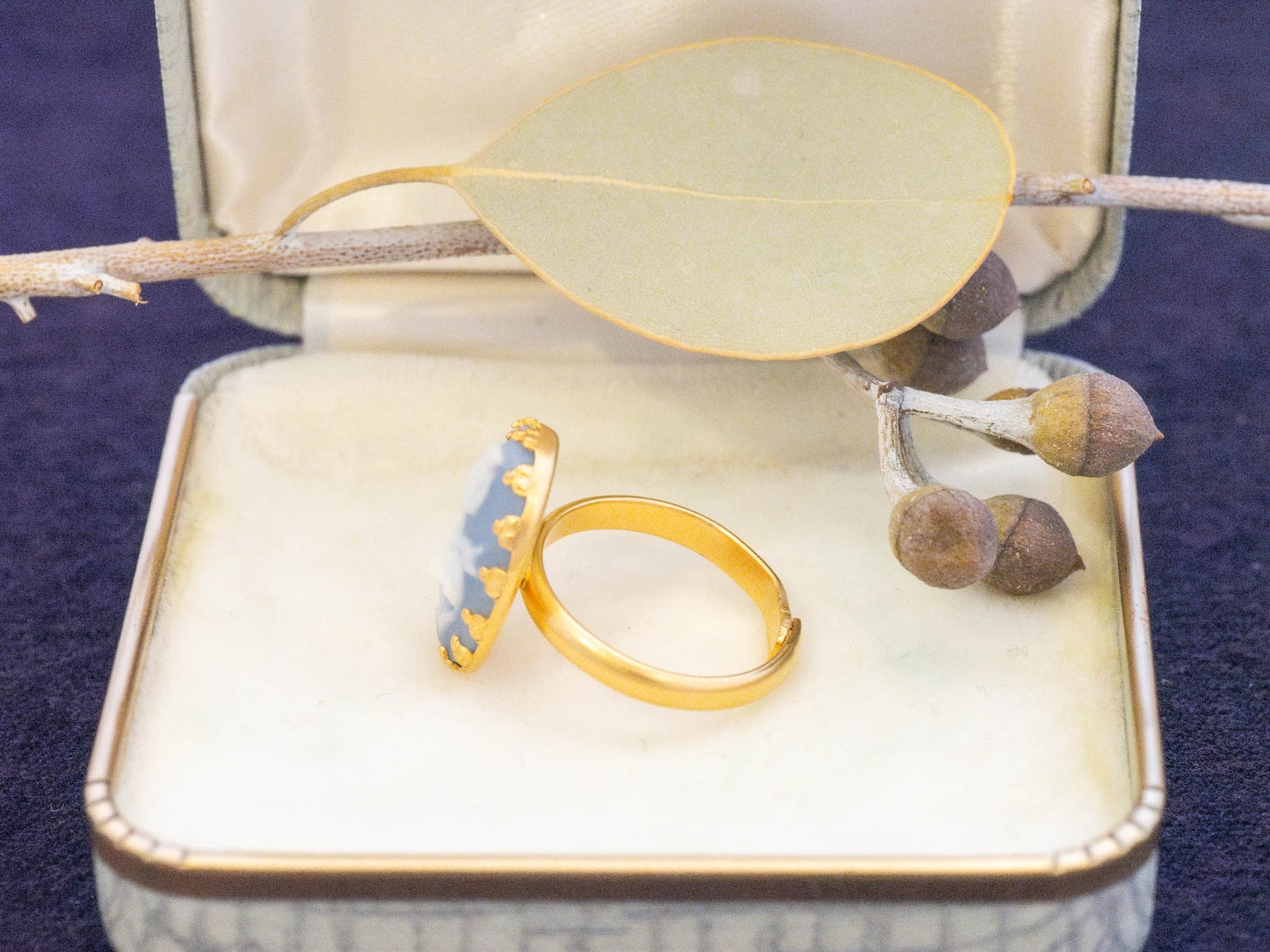 やさしいブルーグレーベースのカラーに、ホワイトで彫られたチューリップが立体的に浮かび上がるカメオパーツをリングに仕立てました。くすみを含んだ色合いは長い時を経たアンティークジュエリーを思わせ落ち着いた気品を感じさせる1品です。
