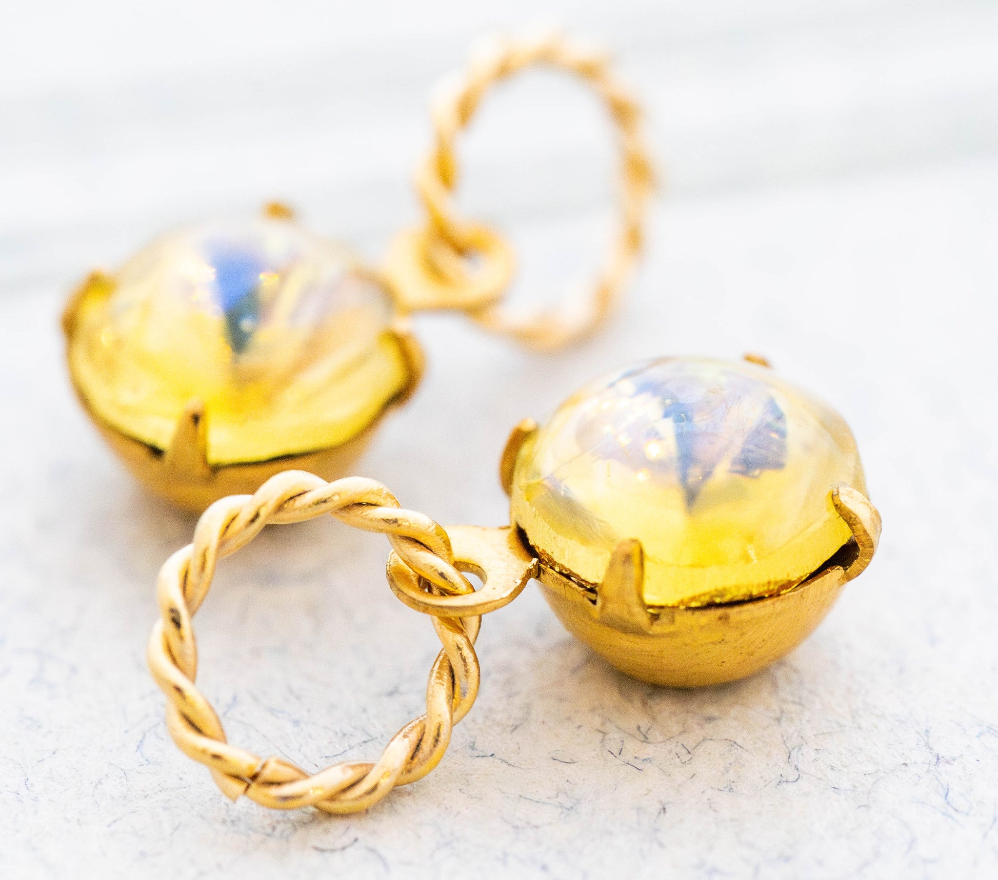 シトリンカラーのベースに、ドラゴンズブレス特有のブルーのシラーが浮かび上がるのが特徴です。表面はツルッとしたドームシェイプに、底面にはカットが施されているので