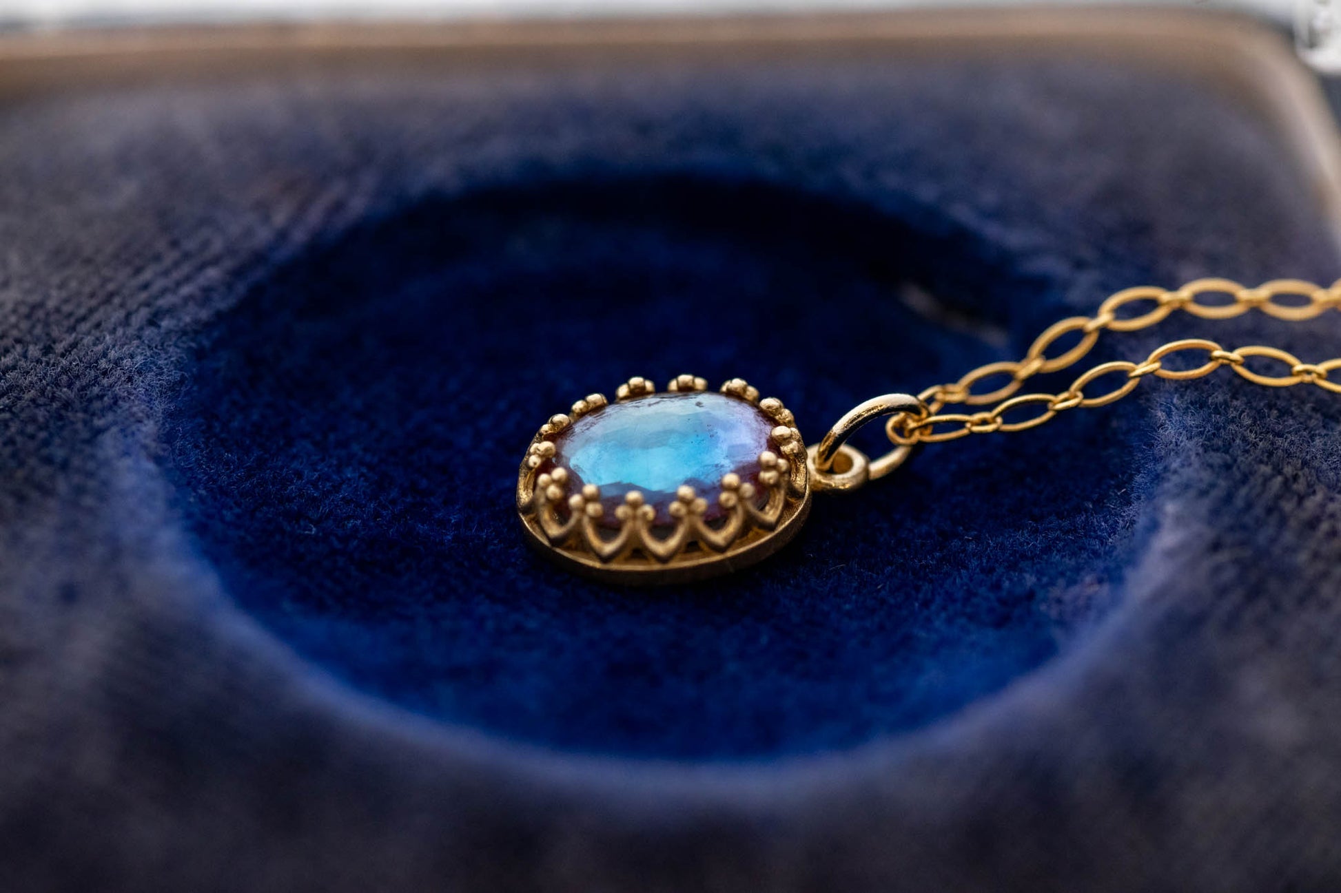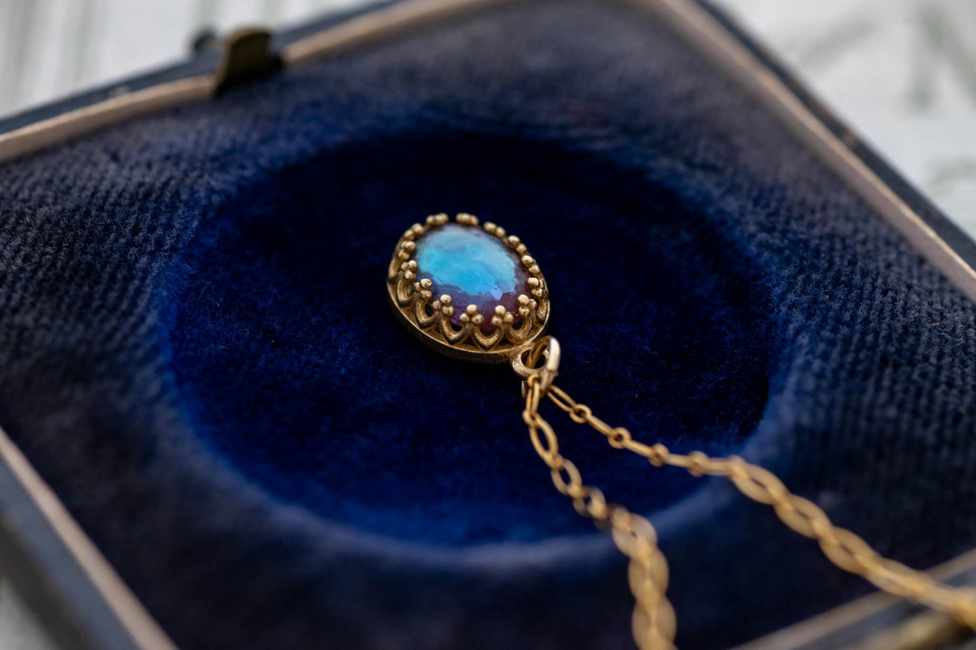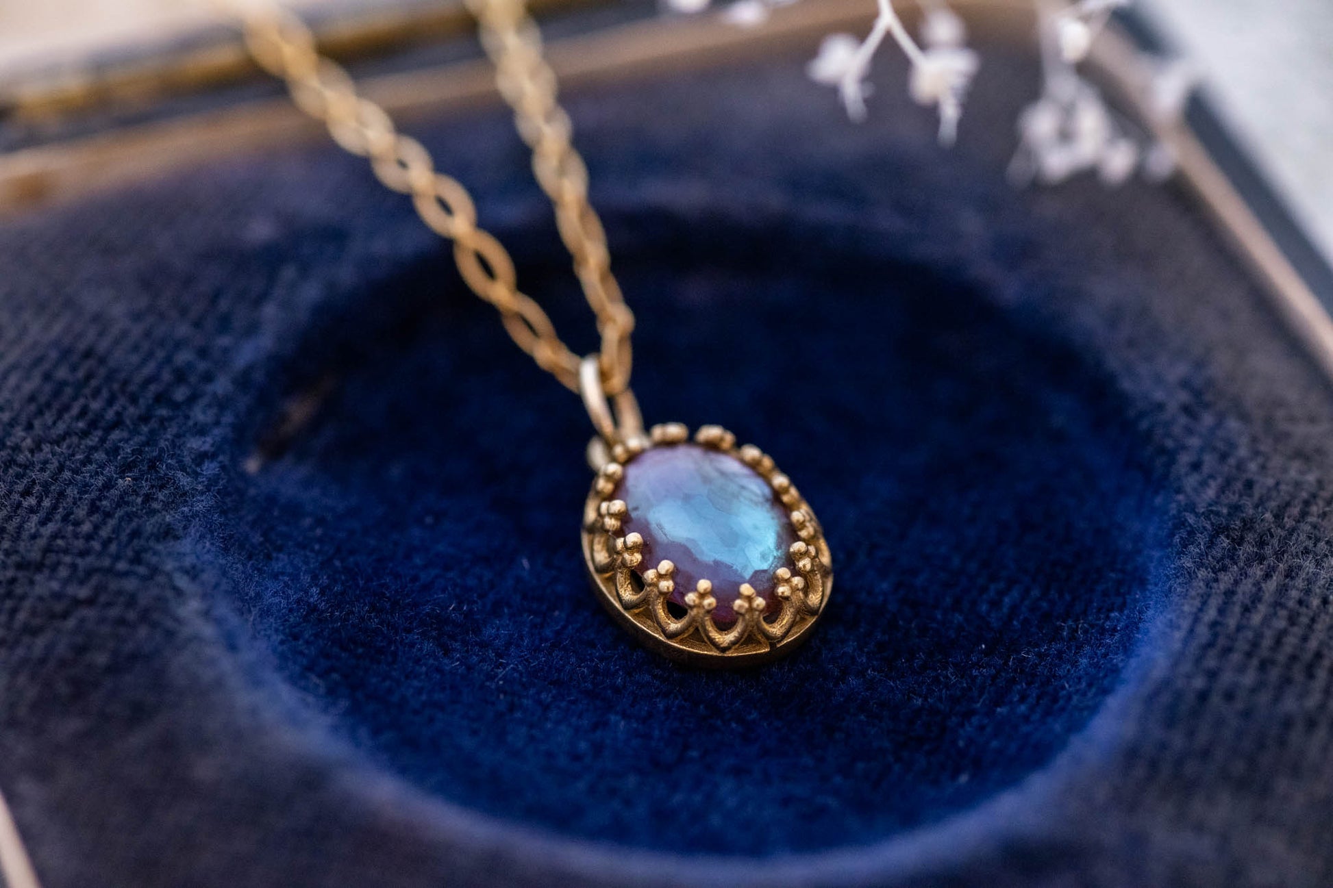こちらのアンティークサフィレットはサファイアブルーからライトブルー、すみれ色からモーブブラウンへの色変化の境界線がなく、角度によって様々な表情を見せてくれます。